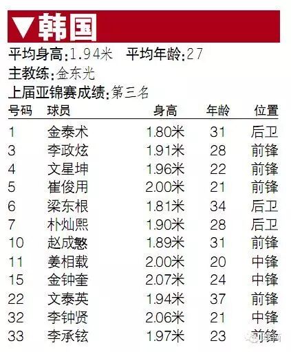 亚洲男篮锦标赛在2015年9月23日于长沙进行,本次比赛的16个球队阵容已经出台,以下为韩国队全名单。