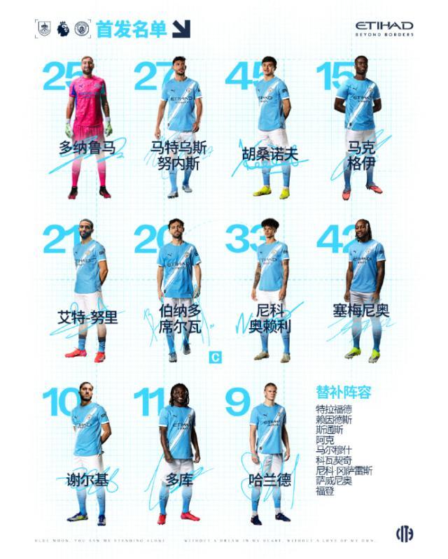曼城阵容(4231):唐纳鲁马/努内斯、胡桑诺夫、格伊、努里(65’尼科·冈萨雷斯)/贝尔纳多·席尔瓦、奥赖利/塞梅尼奥(65’萨维尼奥)、谢尔基、多库/哈兰德