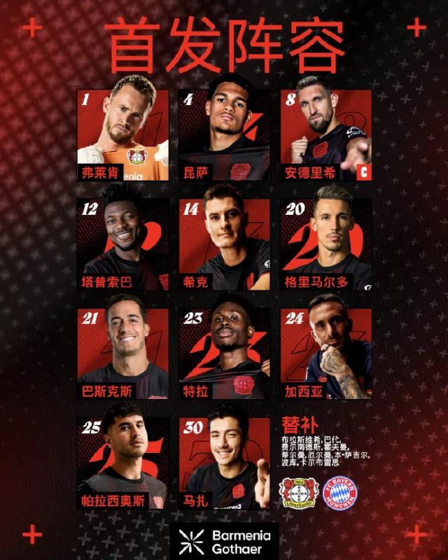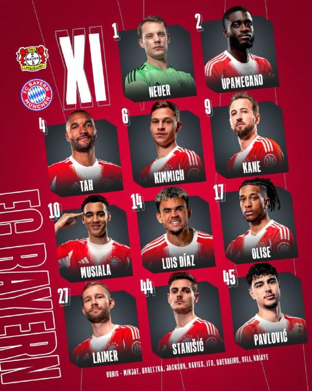 拜仁阵容(4231):诺伊尔/斯塔尼希奇、于帕梅卡诺、若纳唐·塔、莱默(74’阿方索·戴维斯)/基米希、帕夫洛维奇(74’戈雷茨卡)/奥利塞、穆西亚拉(84’金玟哉)、路易斯·迪亚斯/凯恩