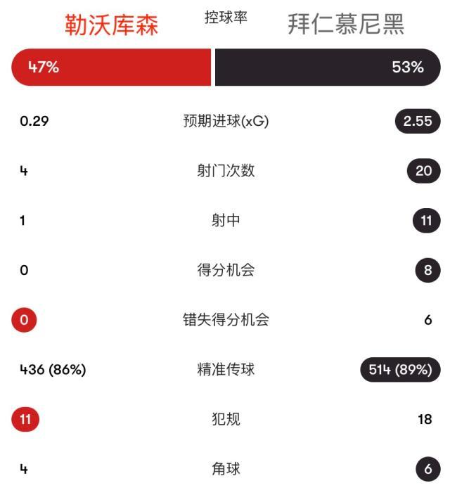 拜仁全场20次射门11次射正,预期进球2.55,药厂仅4射1次射正。拜仁决赛的对手将是周四晚斯图加特和弗赖堡之间的胜者。