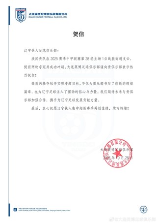 英博祝贺辽宁铁人冲超:为辽宁足球注入新力量