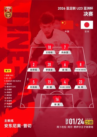 1月24日23:00,U23亚洲杯决赛将在沙特吉达进行,中国U23男足将迎战日本U23男足。