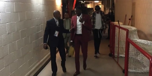 勇士球员赛前入场,不过这个穿格子衫的同学......