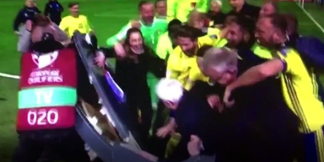 太疯狂!瑞典队员庆祝世界杯出线捣烂电视台转播席