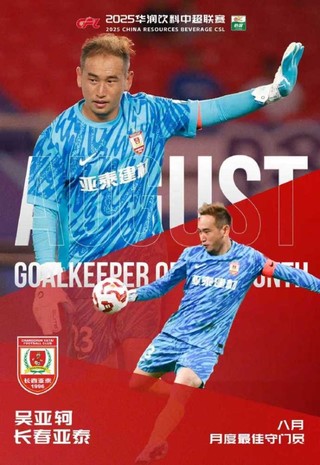 中超联赛官方公布了8月最佳守门员,来自长春亚泰的吴亚轲当选。