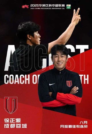 中超联赛官方公布了8月最佳教练,成都蓉城主教练徐正源当选。