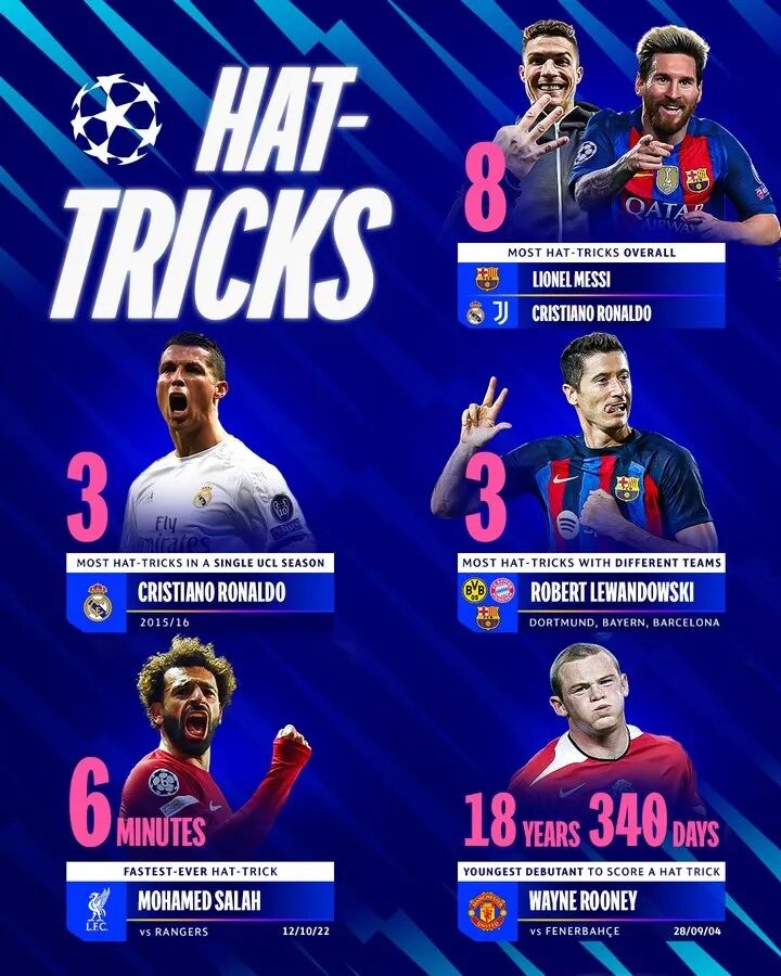 欧冠官方发布了欧冠历史上球员上演帽子戏法的各项纪录。