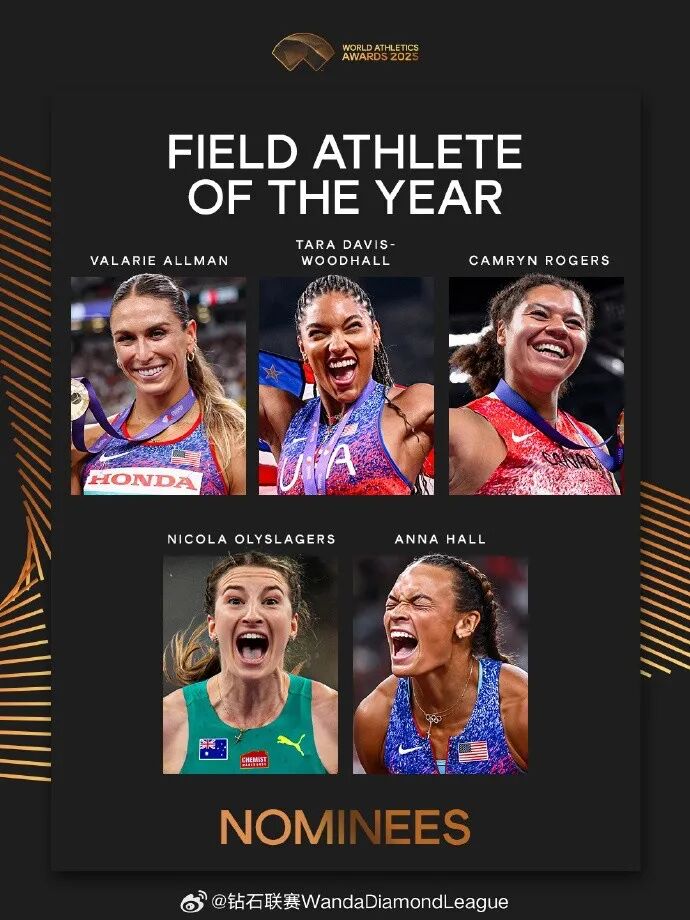 世界田联近日公布了2025年“世界最佳女子田赛运动员”的候选人名单:奥尔曼、戴维斯、豪尔、奥利斯拉格斯、罗杰斯入选。