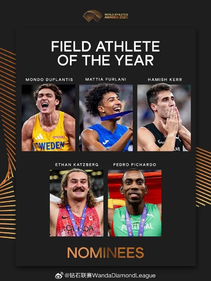世界田联近日公布了2025年“世界最佳男子田赛运动员”的候选人名单:杜普兰蒂斯、弗拉尼、卡兹伯格、科尔、皮查多入选。