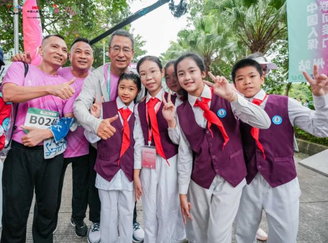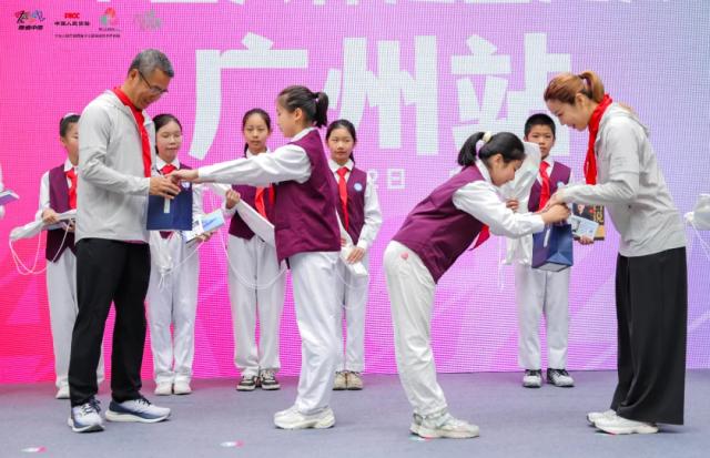 中国人民保险集团品宣部负责人袁红兵,央视主持人白岩松,巴黎奥运会羽毛球女子双打冠军贾一凡,从化区委副书记欧阳可员、副区长胡香玲,以及人保财险广东省分公司党委委员、副总经理周其源等出席鸣枪仪式。仪式前,白岩松、贾一凡代表九城联动组委会向从化区街口街中心小学赠送图书及羽毛球拍,学生则以亲手制作的陶艺茶杯回赠,现场氛围温暖而生动。