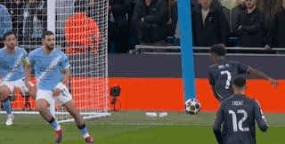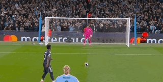 第17分钟,巴尔韦德直塞,维尼修斯左路内切后射门中柱弹出,皇马二次进攻,维尼修斯禁区右侧再次射门,B席在门线上用手臂将球挡出,VAR复核后确认B席手球,主裁判蒂尔潘判罚点球,并将曼城队长红牌罚下。
