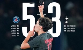 【欧冠】维蒂尼亚戴帽穆阿尼双响!巴黎主场5比3热刺