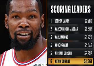 杜兰特来到历史总得分榜第6位。