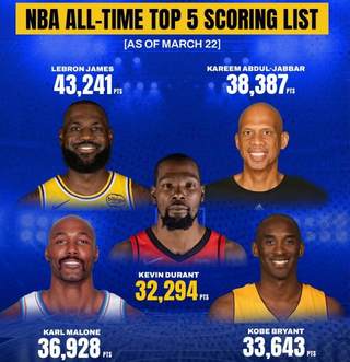 KD总得分超乔丹后还能再升?下赛季超科比 前3很难