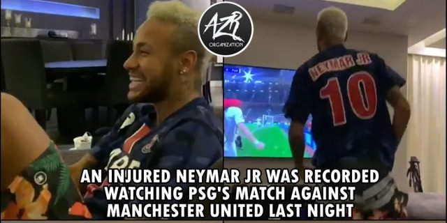 内马尔激情观战巴黎对红魔 调皮模仿姆巴抱胸庆祝