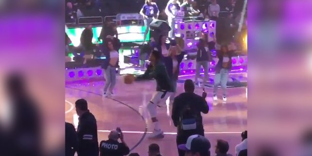 字母哥居然在中场表演的时候还在练三分